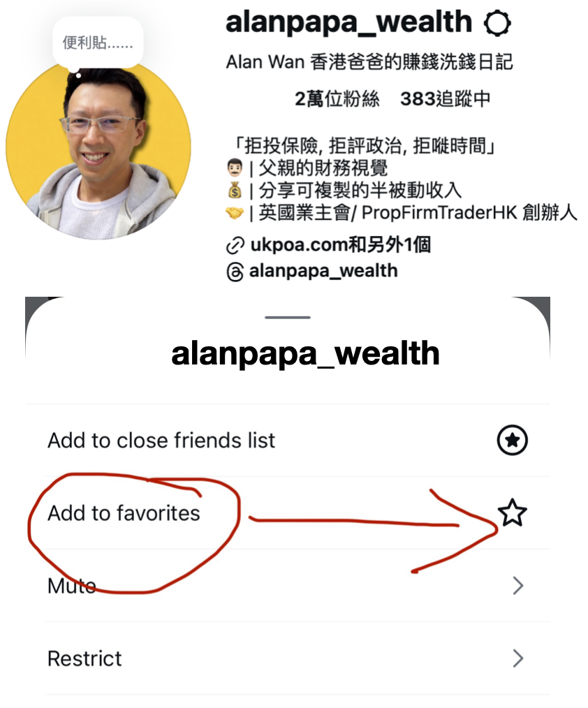 可以FOLLOW我! 記住在我 IG人像內 “Add To Favorites ” 就不會錯過下一條金錢故事REELS.